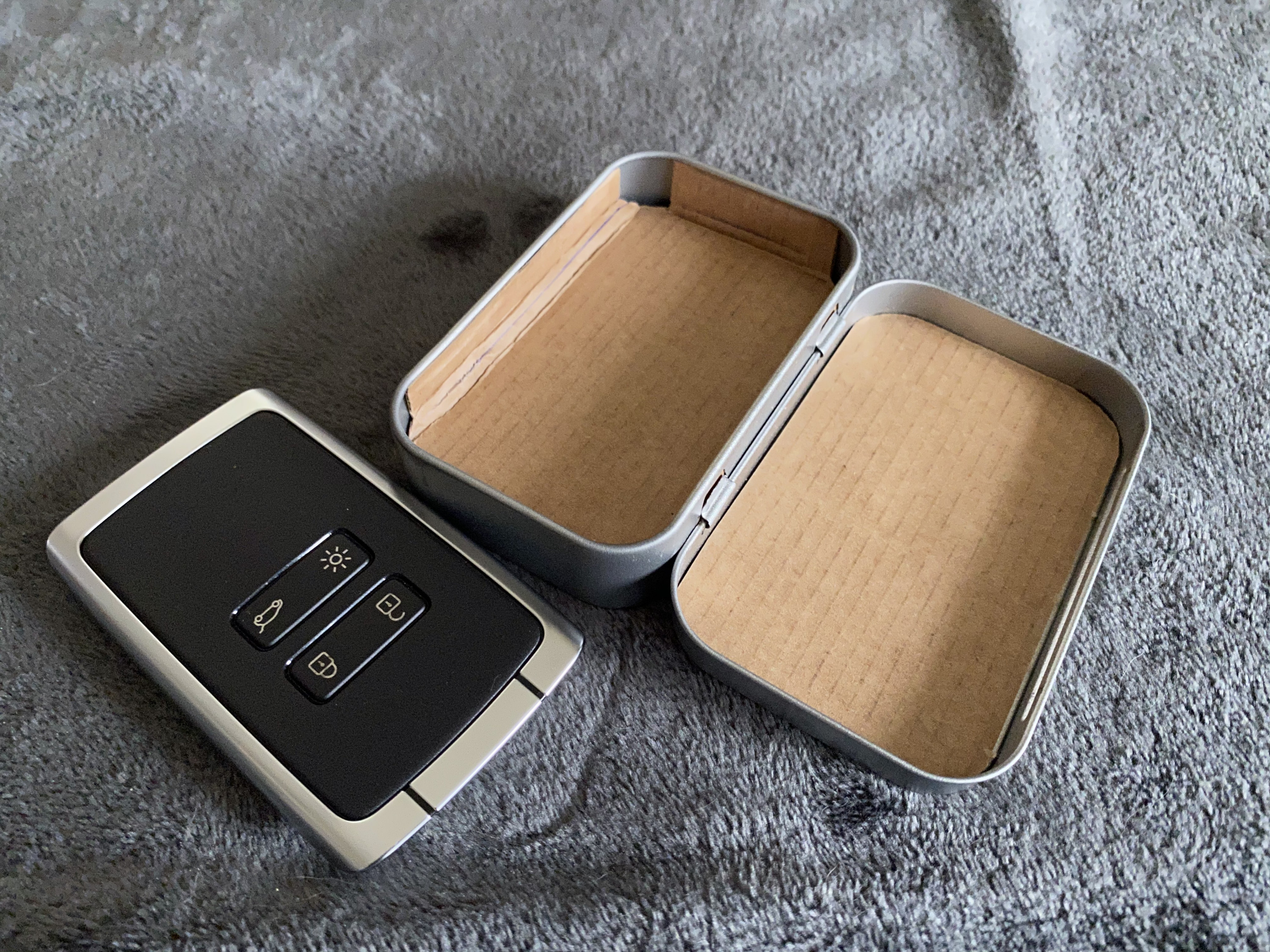 Keycard Case Blechdose. Da die Dose abgerundete Ecken hat passen die Ladekarten nicht ohne anpassen rein. Die Ecken müssen ein wenig gestutzt werden.